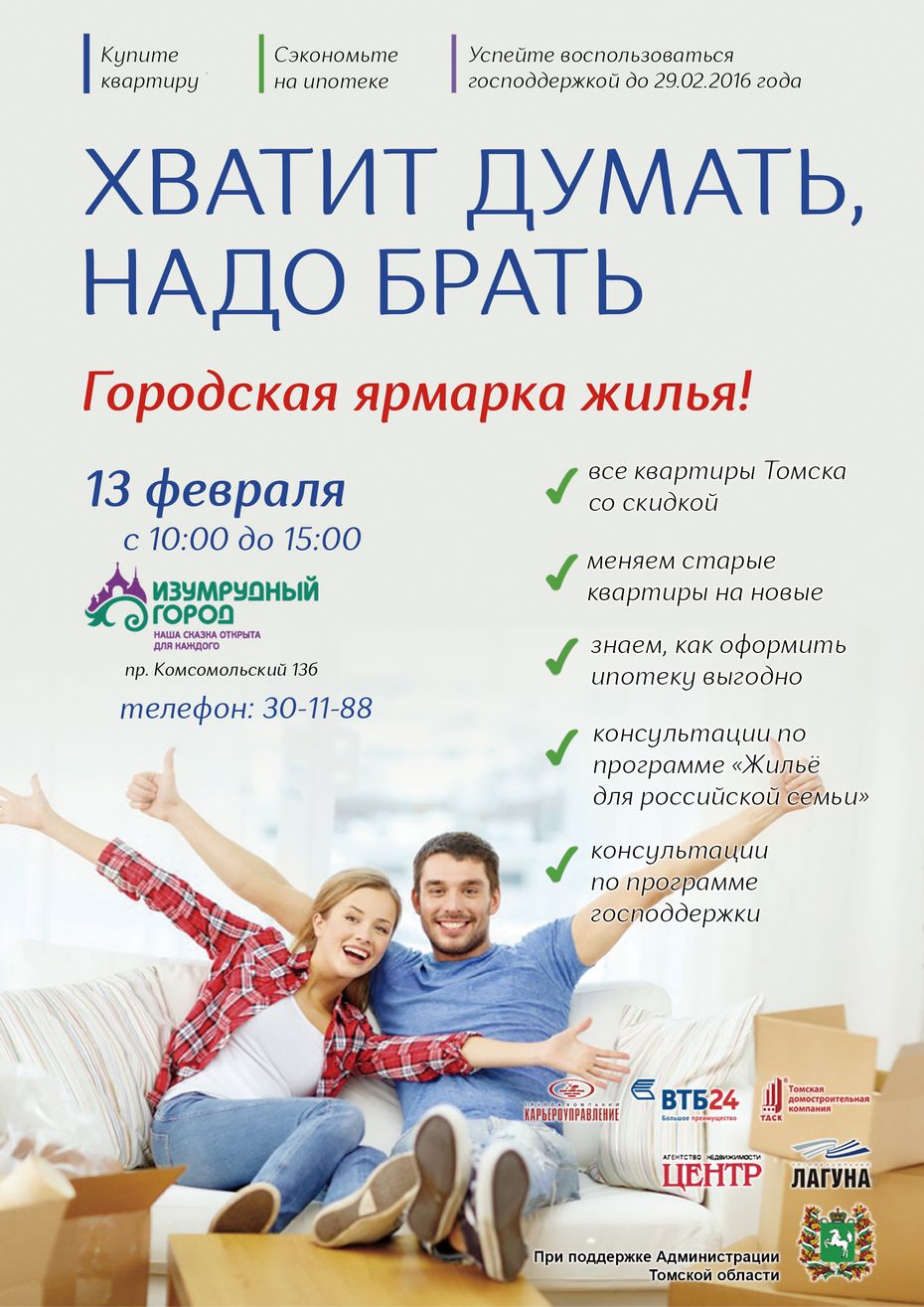 13 февраля, в субботу, с  10.00 до 15.00  в торговом центре «Изумрудный город» при поддержке Администрации Томской области пройдет «Городская ярмарка жилья», принять участие в которой, сможет любой желающий.